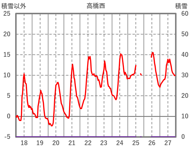 | 日 | 時 | 気温 | 降水 | 風向/風速 | 日照 | 積雪 | 降雪 |