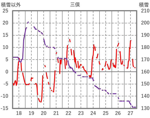 | 日 | 時 | 気温 | 降水 | 風向/風速 | 日照 | 積雪 | 降雪 |