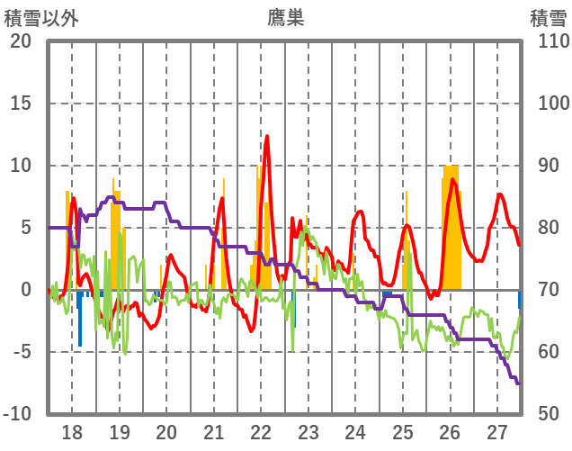 | 日 | 時 | 気温 | 降水 | 風向/風速 | 日照 | 積雪 | 降雪 |