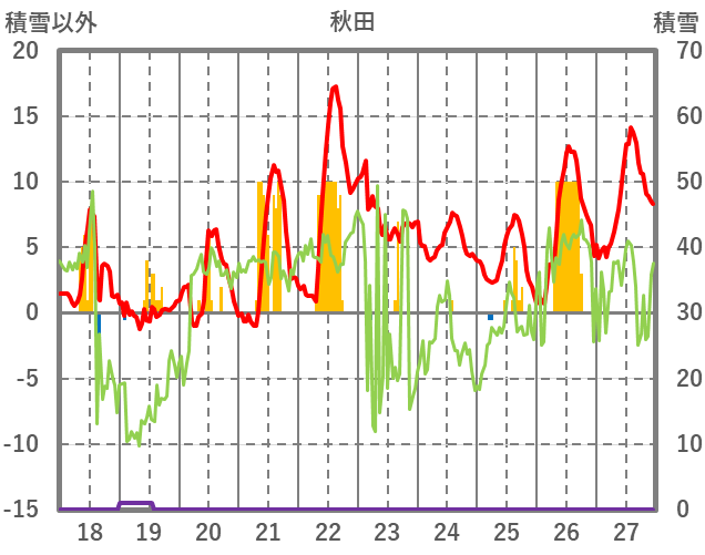 | 日 | 時 | 気温 | 降水 | 風向/風速 | 日照 | 積雪 | 降雪 |