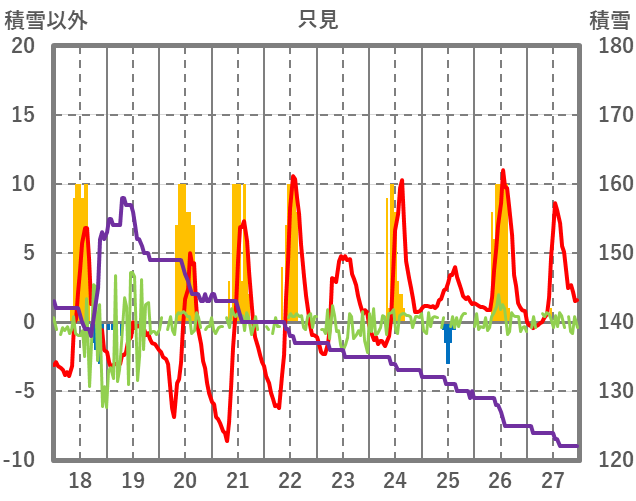 | 日 | 時 | 気温 | 降水 | 風向/風速 | 日照 | 積雪 | 降雪 |