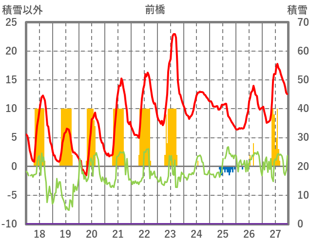 | 日 | 時 | 気温 | 降水 | 風向/風速 | 日照 | 積雪 | 降雪 |