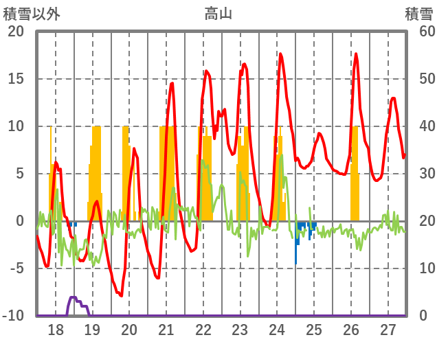 | 日 | 時 | 気温 | 降水 | 風向/風速 | 日照 | 積雪 | 降雪 |