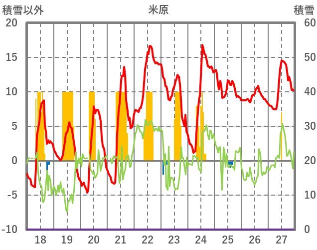 | 日 | 時 | 気温 | 降水 | 風向/風速 | 日照 | 積雪 | 降雪 |