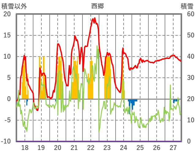 | 日 | 時 | 気温 | 降水 | 風向/風速 | 日照 | 積雪 | 降雪 |