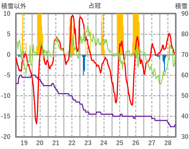 | 日 | 時 | 気温 | 降水 | 風向/風速 | 日照 | 積雪 | 降雪 |