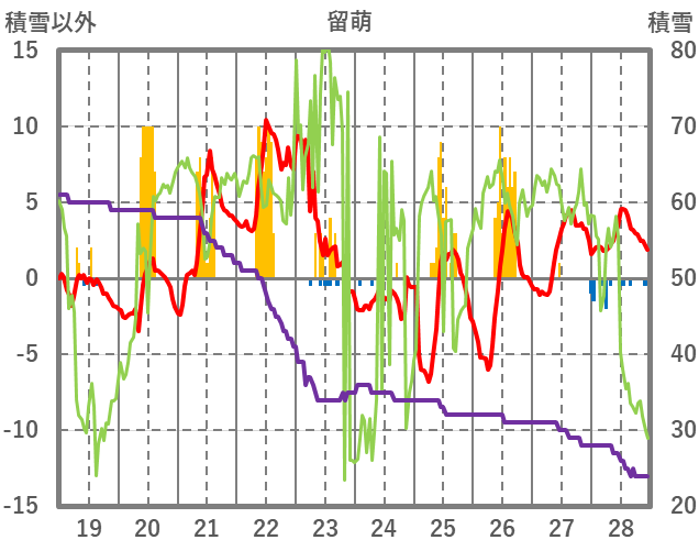 | 日 | 時 | 気温 | 降水 | 風向/風速 | 日照 | 積雪 | 降雪 |