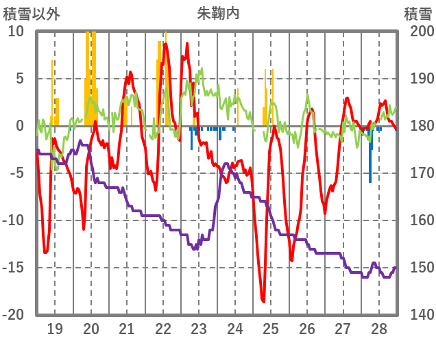 | 日 | 時 | 気温 | 降水 | 風向/風速 | 日照 | 積雪 | 降雪 |