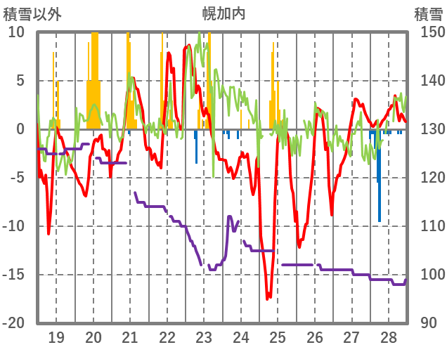 | 日 | 時 | 気温 | 降水 | 風向/風速 | 日照 | 積雪 | 降雪 |