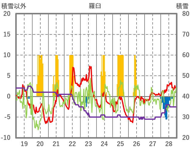 | 日 | 時 | 気温 | 降水 | 風向/風速 | 日照 | 積雪 | 降雪 |