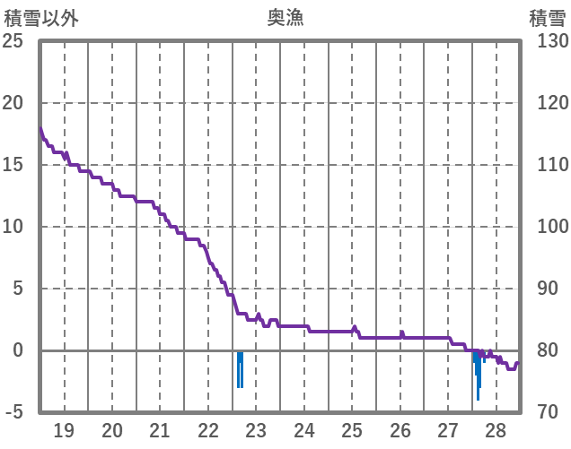| 日 | 時 | 気温 | 降水 | 風向/風速 | 日照 | 積雪 | 降雪 |