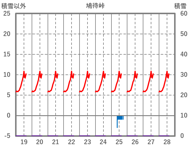 | 日 | 時 | 気温 | 降水 | 風向/風速 | 日照 | 積雪 | 降雪 |