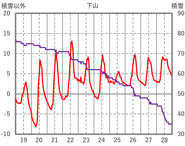 | 日 | 時 | 気温 | 降水 | 風向/風速 | 日照 | 積雪 | 降雪 |