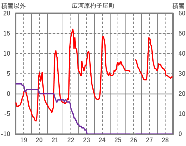 | 日 | 時 | 気温 | 降水 | 風向/風速 | 日照 | 積雪 | 降雪 |