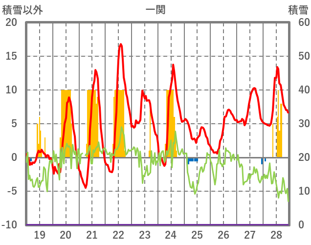 | 日 | 時 | 気温 | 降水 | 風向/風速 | 日照 | 積雪 | 降雪 |
