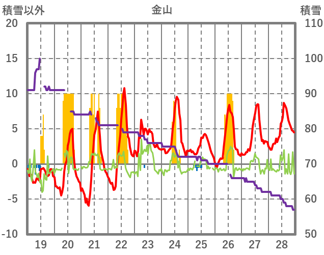 | 日 | 時 | 気温 | 降水 | 風向/風速 | 日照 | 積雪 | 降雪 |