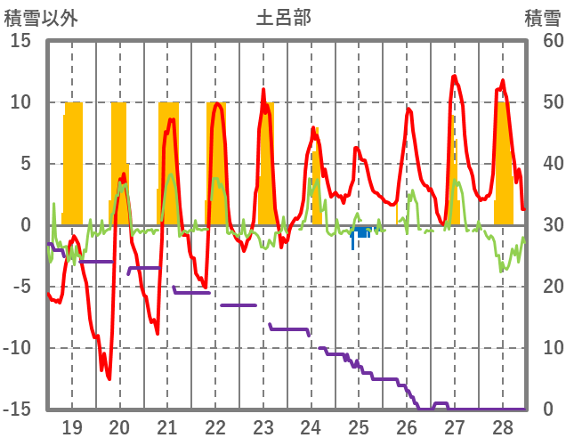 | 日 | 時 | 気温 | 降水 | 風向/風速 | 日照 | 積雪 | 降雪 |