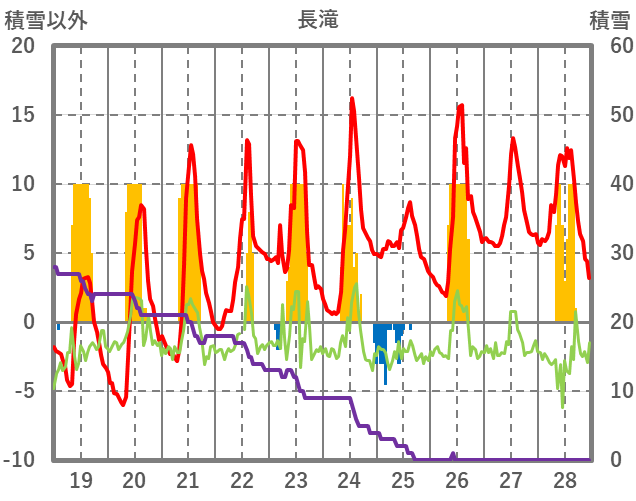 | 日 | 時 | 気温 | 降水 | 風向/風速 | 日照 | 積雪 | 降雪 |