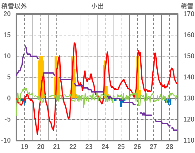 | 日 | 時 | 気温 | 降水 | 風向/風速 | 日照 | 積雪 | 降雪 |