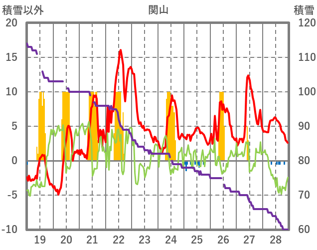 | 日 | 時 | 気温 | 降水 | 風向/風速 | 日照 | 積雪 | 降雪 |