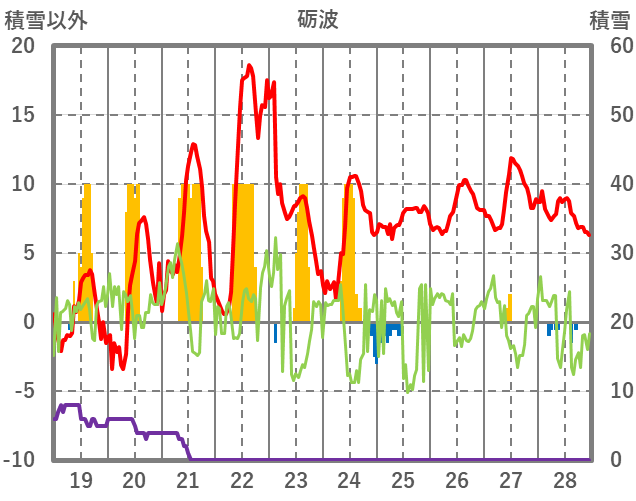 | 日 | 時 | 気温 | 降水 | 風向/風速 | 日照 | 積雪 | 降雪 |