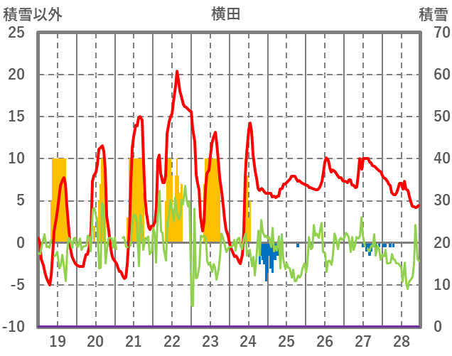 | 日 | 時 | 気温 | 降水 | 風向/風速 | 日照 | 積雪 | 降雪 |