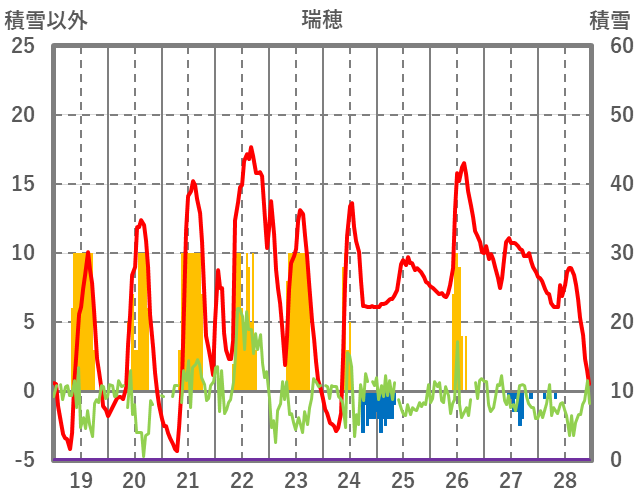 | 日 | 時 | 気温 | 降水 | 風向/風速 | 日照 | 積雪 | 降雪 |