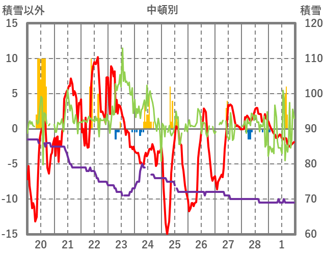 | 日 | 時 | 気温 | 降水 | 風向/風速 | 日照 | 積雪 | 降雪 |