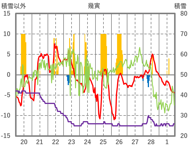 | 日 | 時 | 気温 | 降水 | 風向/風速 | 日照 | 積雪 | 降雪 |