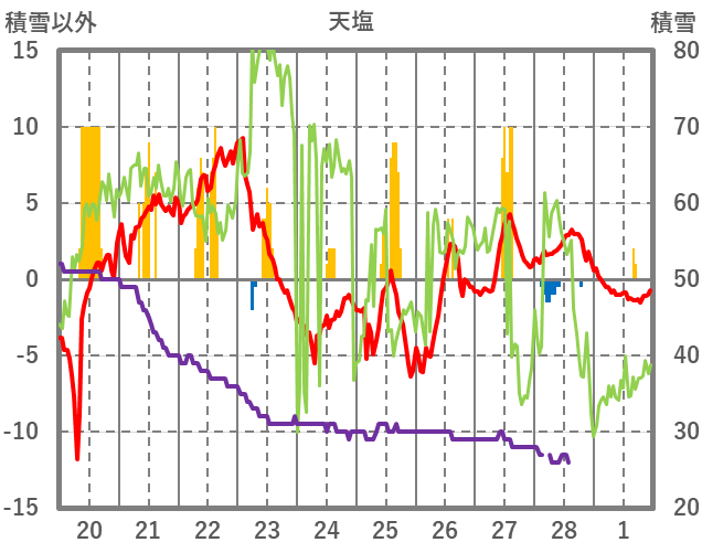 | 日 | 時 | 気温 | 降水 | 風向/風速 | 日照 | 積雪 | 降雪 |