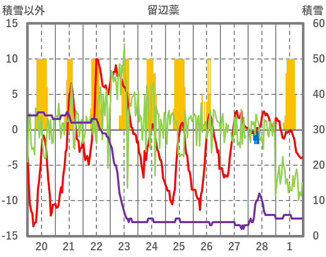 | 日 | 時 | 気温 | 降水 | 風向/風速 | 日照 | 積雪 | 降雪 |