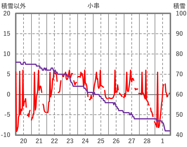 | 日 | 時 | 気温 | 降水 | 風向/風速 | 日照 | 積雪 | 降雪 |