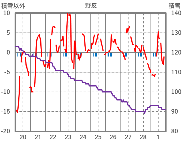 | 日 | 時 | 気温 | 降水 | 風向/風速 | 日照 | 積雪 | 降雪 |