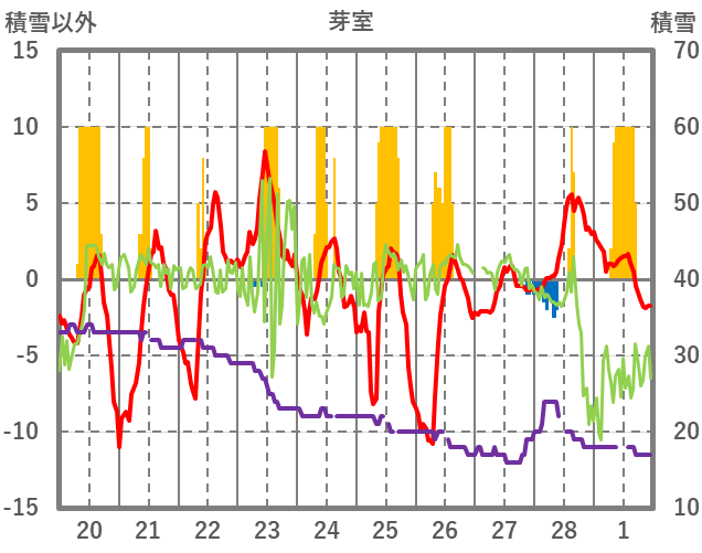 | 日 | 時 | 気温 | 降水 | 風向/風速 | 日照 | 積雪 | 降雪 |