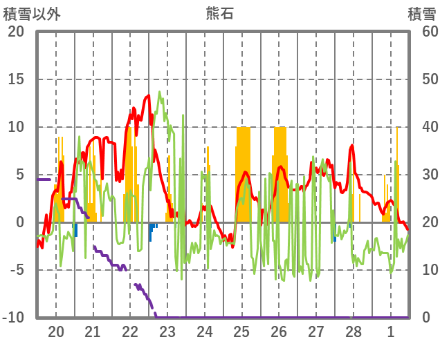 | 日 | 時 | 気温 | 降水 | 風向/風速 | 日照 | 積雪 | 降雪 |