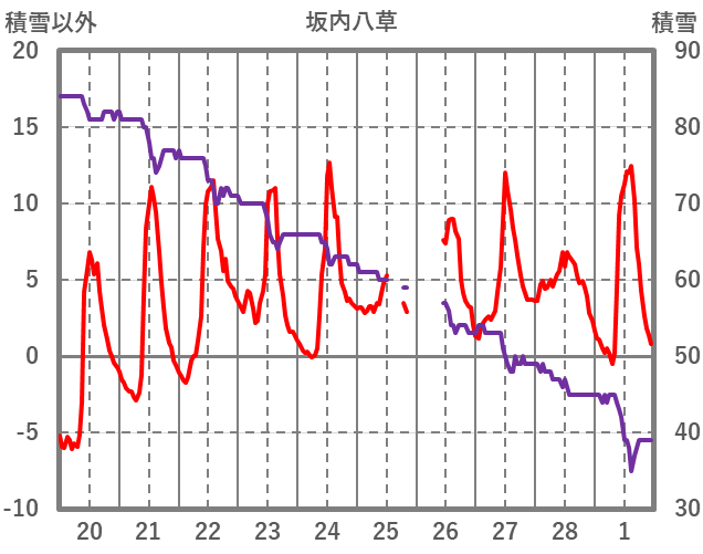 | 日 | 時 | 気温 | 降水 | 風向/風速 | 日照 | 積雪 | 降雪 |