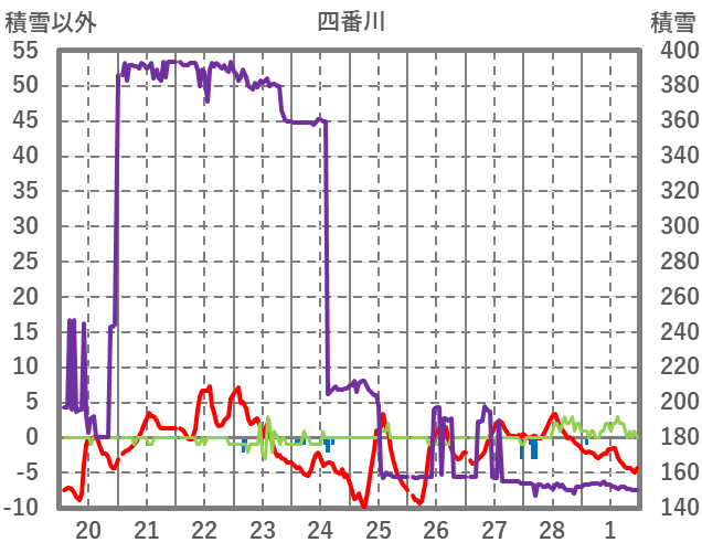 | 日 | 時 | 気温 | 降水 | 風向/風速 | 日照 | 積雪 | 降雪 |