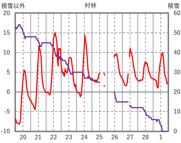 | 日 | 時 | 気温 | 降水 | 風向/風速 | 日照 | 積雪 | 降雪 |