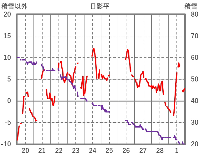 | 日 | 時 | 気温 | 降水 | 風向/風速 | 日照 | 積雪 | 降雪 |