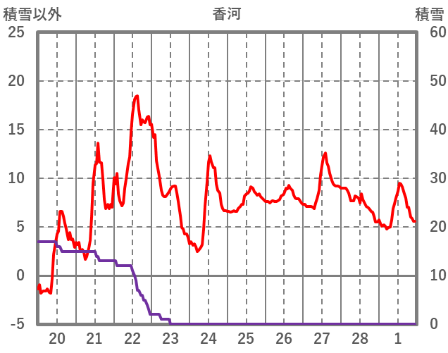 | 日 | 時 | 気温 | 降水 | 風向/風速 | 日照 | 積雪 | 降雪 |