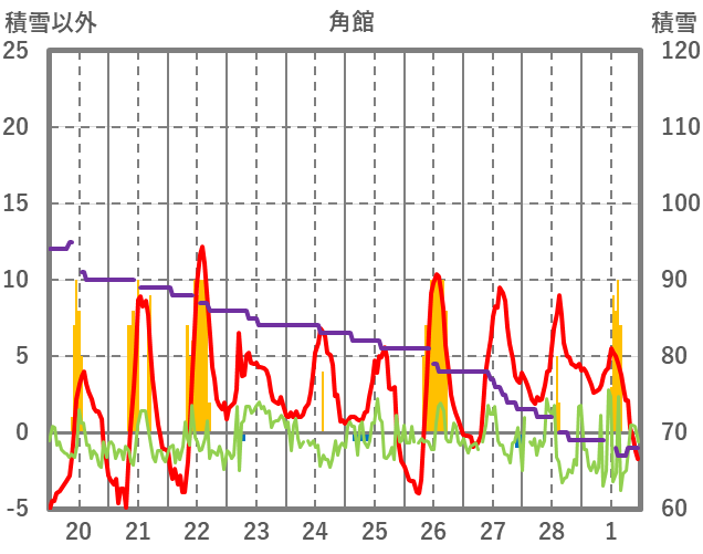 | 日 | 時 | 気温 | 降水 | 風向/風速 | 日照 | 積雪 | 降雪 |