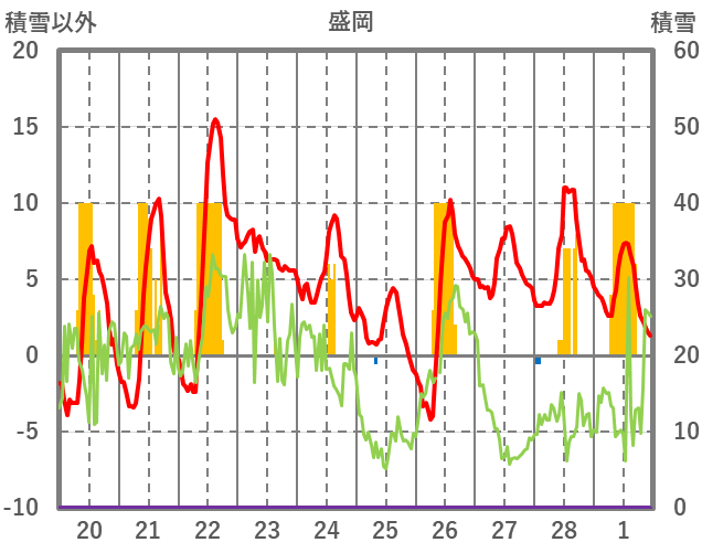 | 日 | 時 | 気温 | 降水 | 風向/風速 | 日照 | 積雪 | 降雪 |