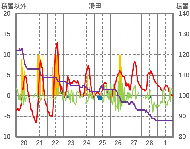 | 日 | 時 | 気温 | 降水 | 風向/風速 | 日照 | 積雪 | 降雪 |