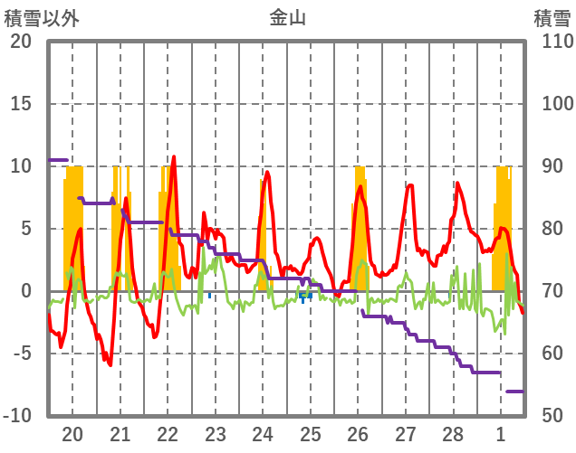 | 日 | 時 | 気温 | 降水 | 風向/風速 | 日照 | 積雪 | 降雪 |