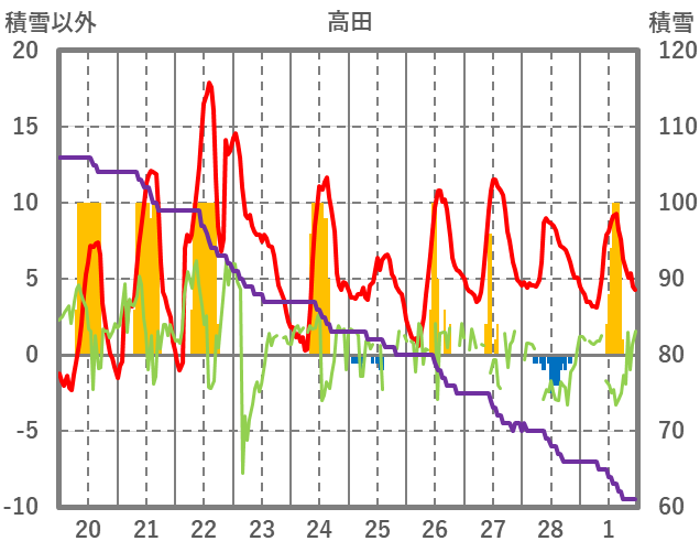 | 日 | 時 | 気温 | 降水 | 風向/風速 | 日照 | 積雪 | 降雪 |