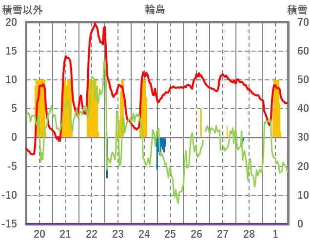 | 日 | 時 | 気温 | 降水 | 風向/風速 | 日照 | 積雪 | 降雪 |
