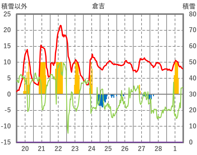 | 日 | 時 | 気温 | 降水 | 風向/風速 | 日照 | 積雪 | 降雪 |