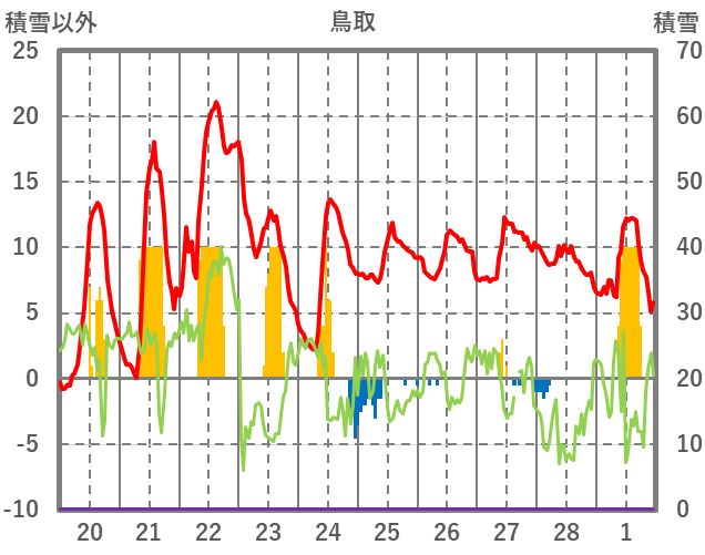 | 日 | 時 | 気温 | 降水 | 風向/風速 | 日照 | 積雪 | 降雪 |