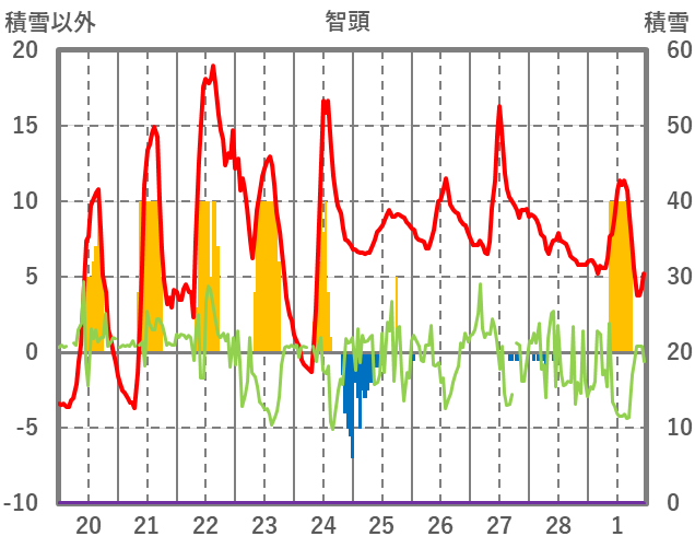 | 日 | 時 | 気温 | 降水 | 風向/風速 | 日照 | 積雪 | 降雪 |
