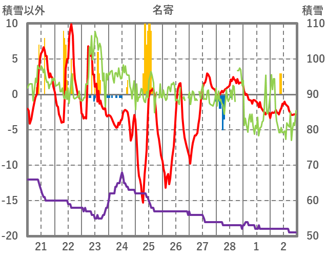 | 日 | 時 | 気温 | 降水 | 風向/風速 | 日照 | 積雪 | 降雪 |